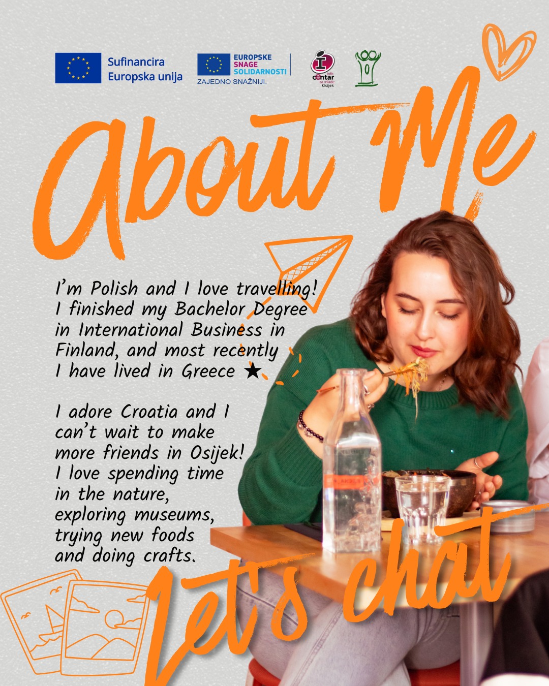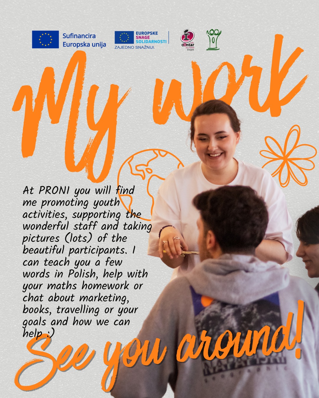 Osijek joj se toliko svidio da se vratila po još, a sada će svoje znanje i iskustva primijeniti u novom okruženju, doprinoseći našoj organizaciji.  U našoj organizaciji Natalia će sudjelovati u pripremi i provedbi aktivnosti za mlade povezanih s održivim razvojem, ali će biti uključena i u promociju programa Europske snage solidarnosti kako bi se što više mladih informiralo o navedenom programu.