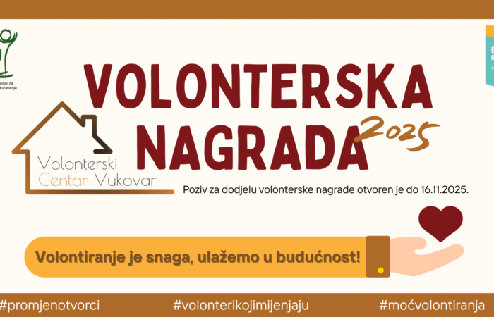 Author Ured Vukovar Published on: 3. studenoga 2025. Natječaj za dodjelu volonterske nagrade za 2025. godinu Povodom obilježavanja Međunarodnog dana volontera, Volonterski centar Vukovar objavljuje: Natječaj za dodjelu volonterske nagrade za 2025. godinu Volonterski centar Vukovar