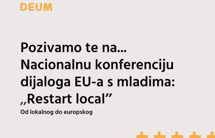 Author Ured Vukovar Published on: 3. prosinca 2024. Poziv za mlade: Nacionalna konferencija “Restart local” Mreža mladih Hrvatske (MMH) poziva te na Nacionalnu konferenciju dijaloga EU-a s mladima: “Restart local”. 10. i 11. prosinca, MMH