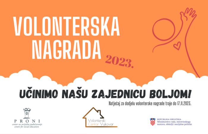 Povodom obilježavanja Međunarodnog dana volontera, 5. prosinca, Volonterski centar Vukovar objavljuje: NATJEČAJ ZA DODJELU VOLONTERSKE NAGRADE ZA 2023. pod sloganom “Učinimo