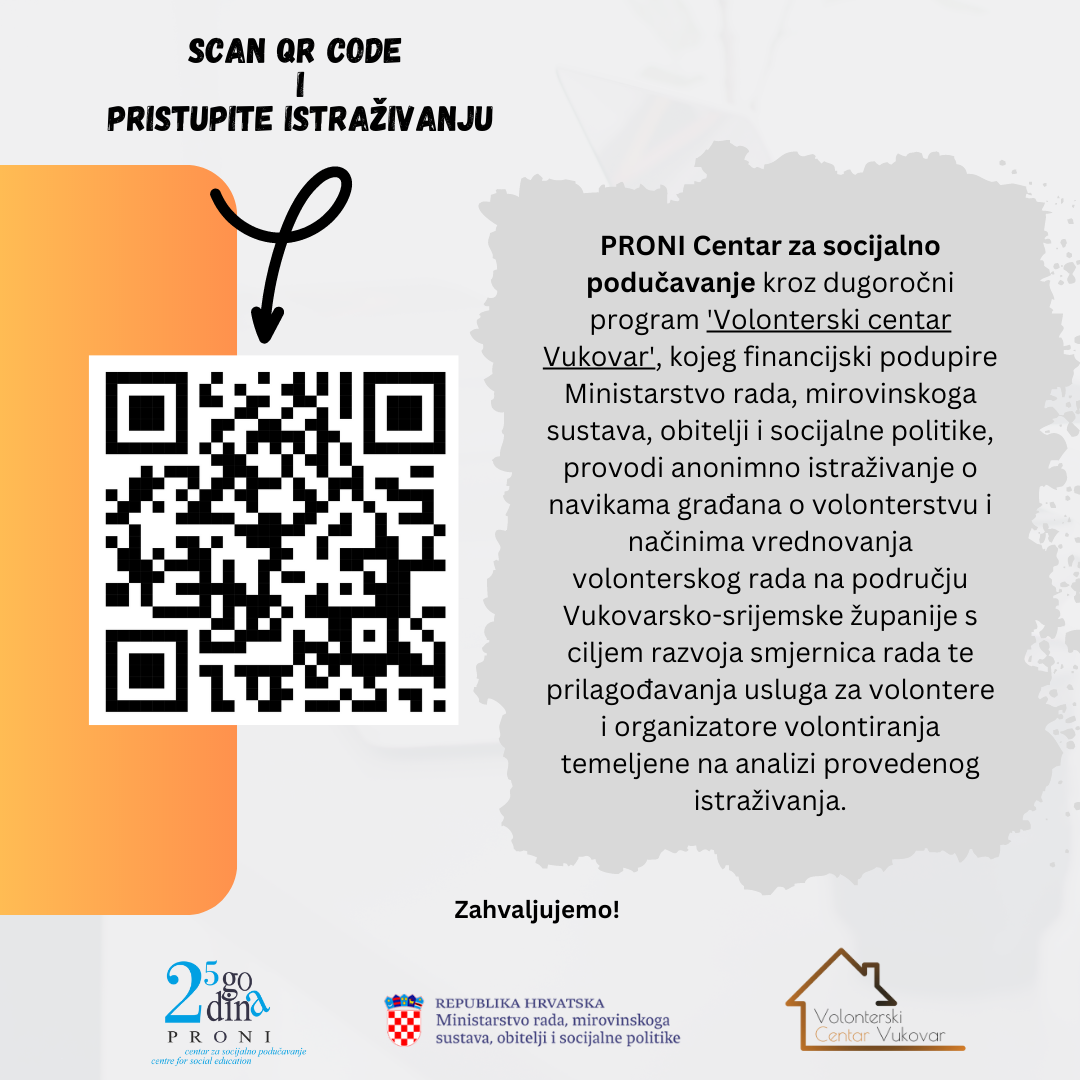 PRONI Centar za socijalno podučavanje kroz dugoročni program ‘Volonterski centar Vukovar’, kojeg financijski podupire Ministarstvo rada, mirovinskoga sustava, obitelji i socijalne politike, provodi anonimno istraživanje o navikama građana o volonterstvu i načinima vrednovanja volonterskog rada na području Vukovarsko-srijemske županije s ciljem razvoja smjernica rada te prilagođavanja usluga za volontere i organizatore volontiranja temeljene na analizi provedenog istraživanja.