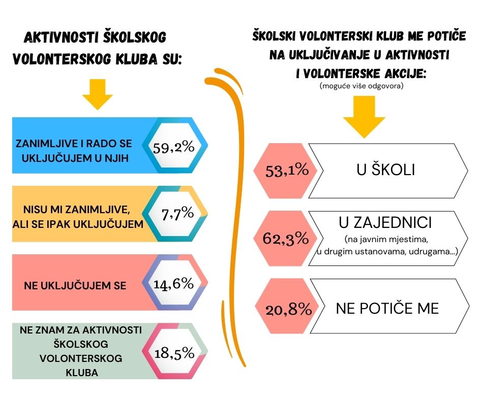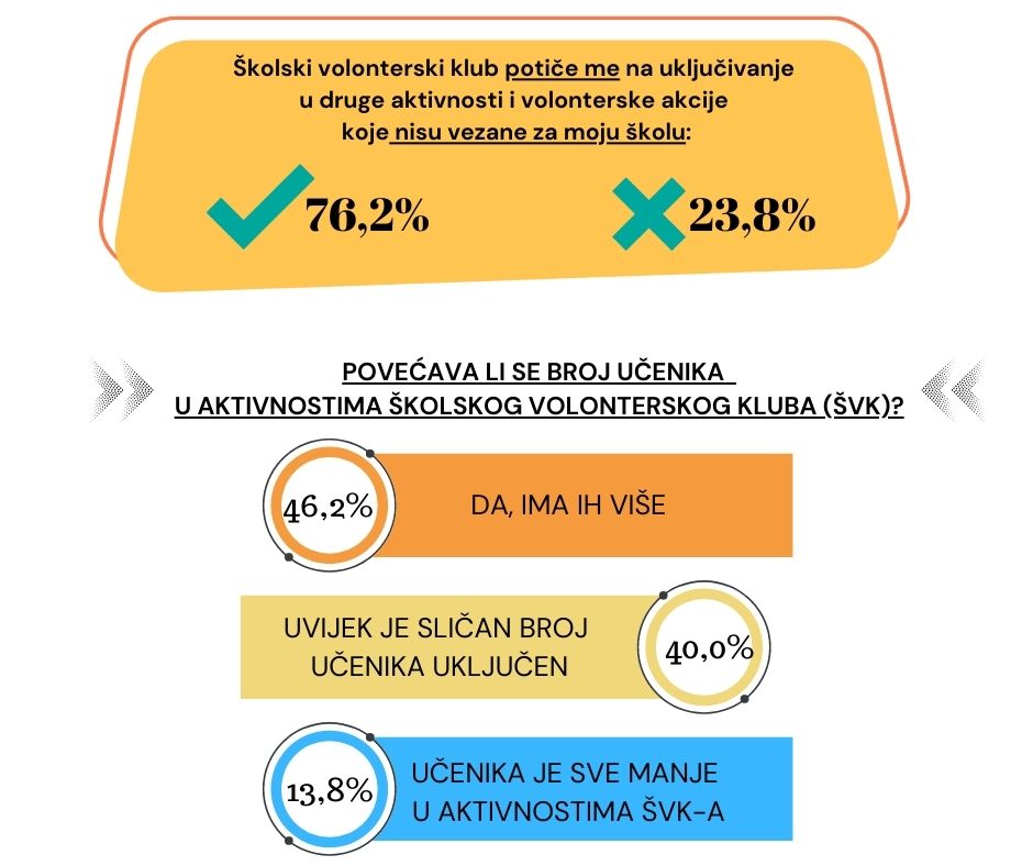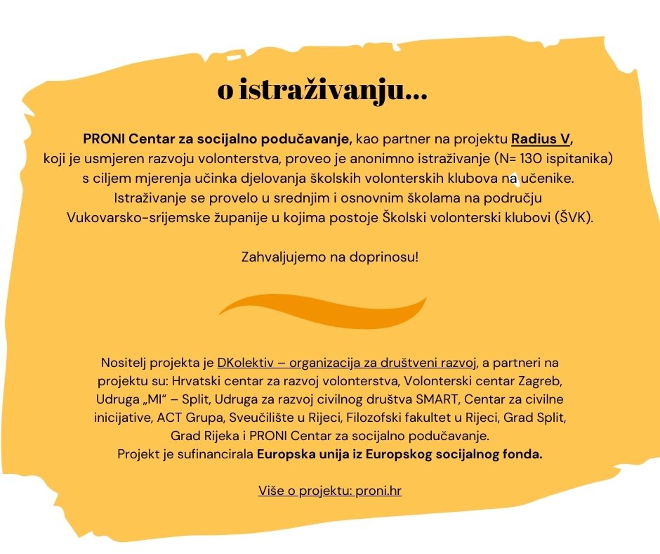 PRONI Centar za socijalno podučavanje, kao partner na projektu Radius V, koji je usmjeren razvoju volonterstva, tijekom lipnja 2023. godine proveo je anonimno istraživanje (N= 130 ispitanika) s ciljem mjerenja učinka djelovanja školskih volonterskih klubova na učenike.