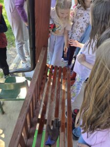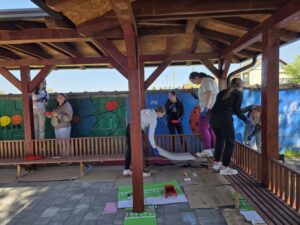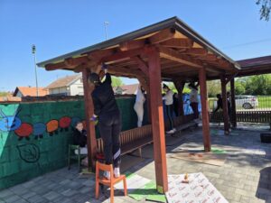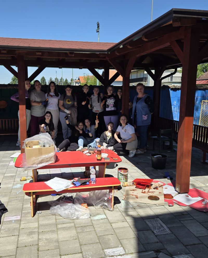 S puno dobre volje, osmijeha i radosti učenici/volonteri su zajedno renovirali i osviježili novim slojem laka dvije sjenice, kao i klupe u dvorištu predškolske ustanove.