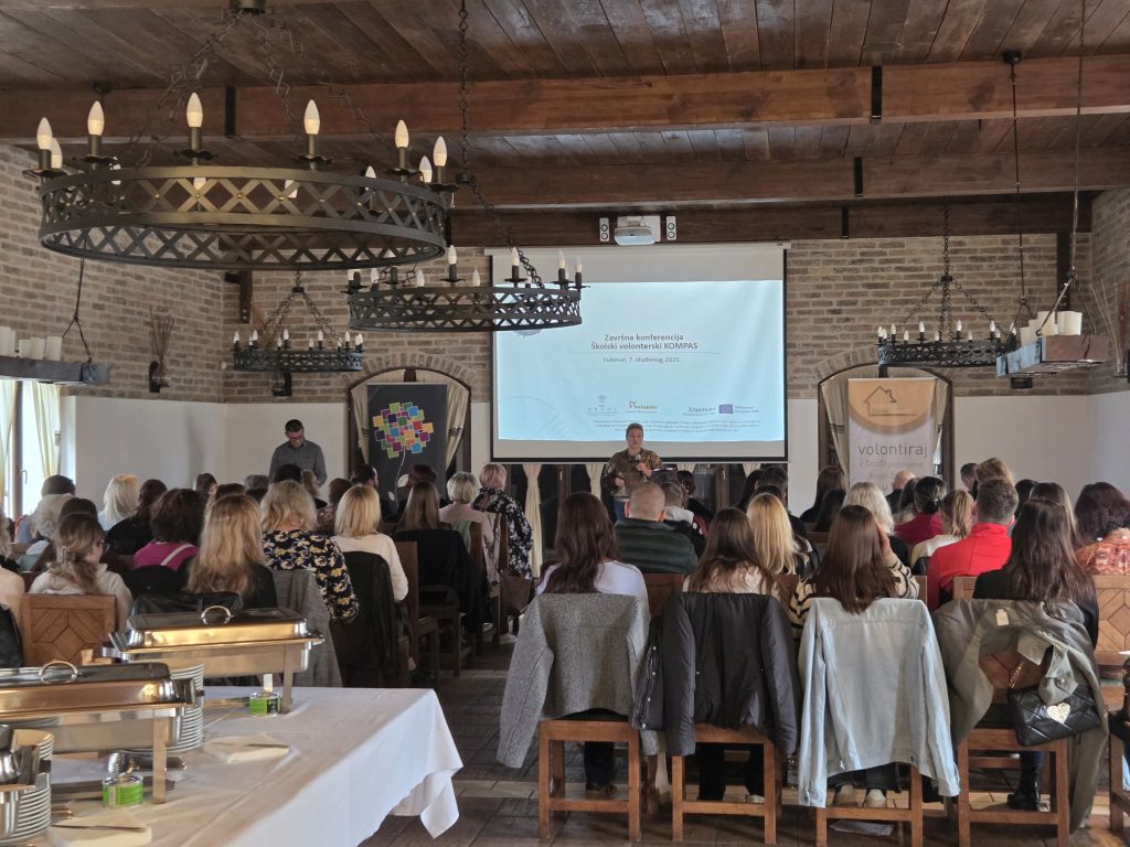 Nakon nešto više od 10 mjeseci rada na provedbi projekta “Školski volonterski KOMPAS“, tijekom kojeg su organizirane tematske rasprave s mladima i donositeljima odluka u šest gradova Osječko-baranjske i Vukovarsko-srijemske županije, te provedena mobilnost u Pirovcu potkraj osmog mjeseca, prilikom kojih smo s učenicima, djelatnicima škola i drugih dionika razmijenili iskustva i primjere dobre prakse djelovanja školskih volonterskih klubova, analizirali postojeća stanja i definirali područja za poboljšanje, u Vinogradarskoj kući Goldschmidt u Vukovaru, u petak 7.11. organizirana je Završna konferencija.