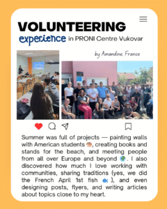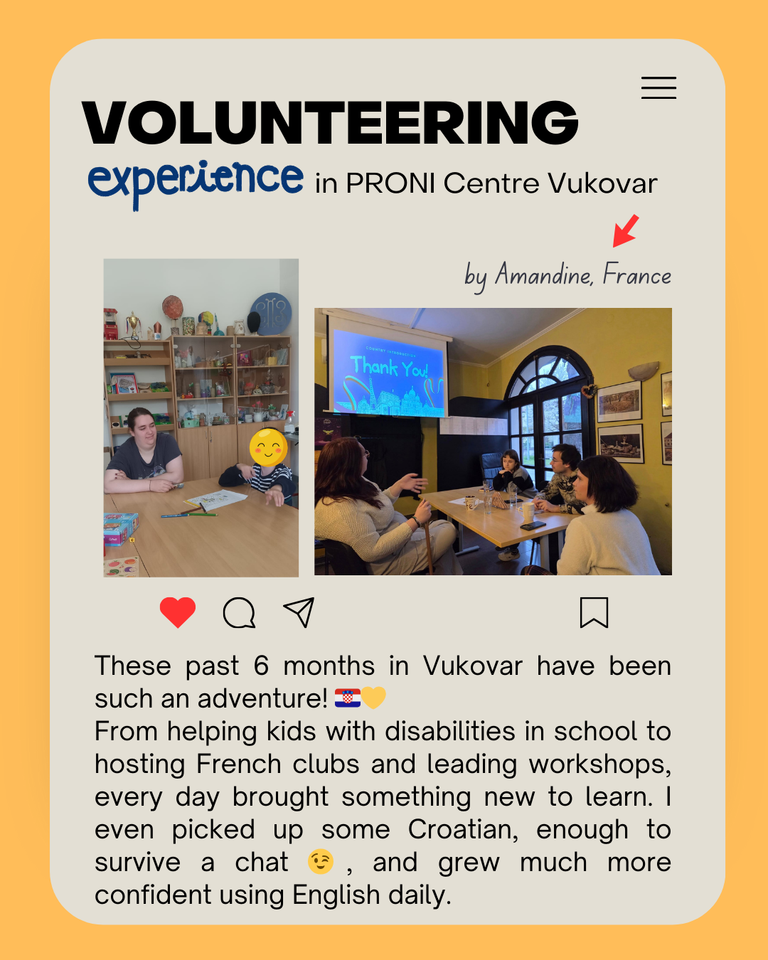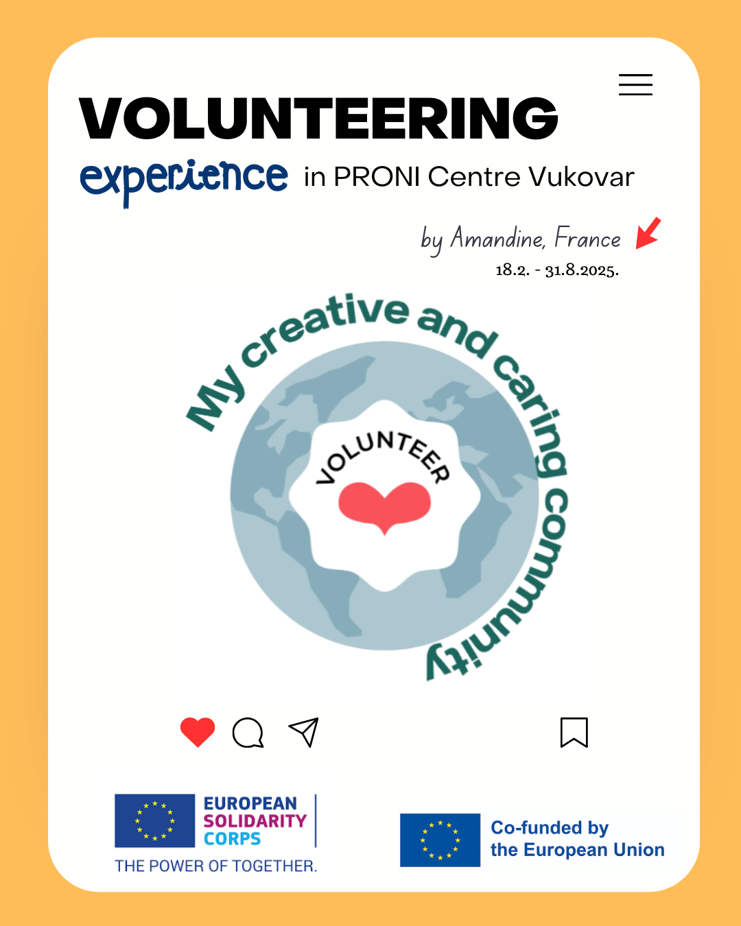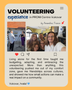 Amandine je volontirala na projektu “Moja kreativna i brižna zajednica” u periodu od 18. veljače do 31. kolovoza 2025. godine u vukovarskom uredu PRONI Centra. Tijekom volontiranja na projektu, Amandine je provodila kreativne radionice za djecu i mlade s teškoćama u razvoju u OŠ Josipa Matoša Vukovar, sudjelovala je u raznim volonterskim aktivnostima Volonterskog centra Vukovar, pisala informative članke za mlade u okviru Info centra za mlade Vukovar, okušala se u davanju izjava medijima te u izradi novih proizvoda i time stekla nove vještine.